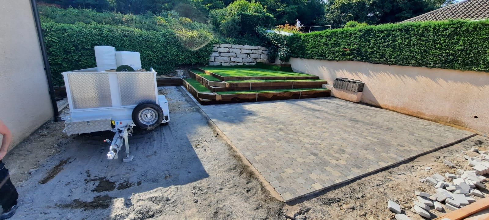 Conception, démolition, terrassement, plantation, arrosage automatique, dalles alvéolaires, gravier, mur de soutènement en chêne, gazon synthétique, pavage…